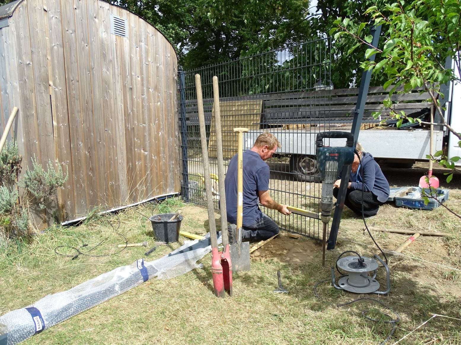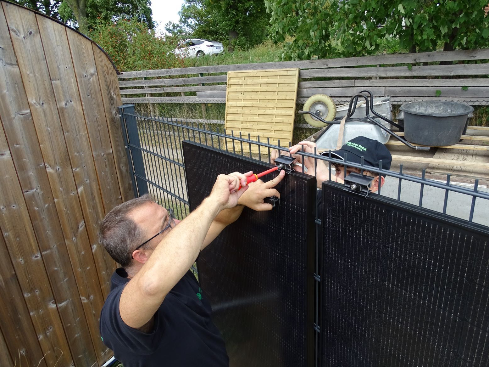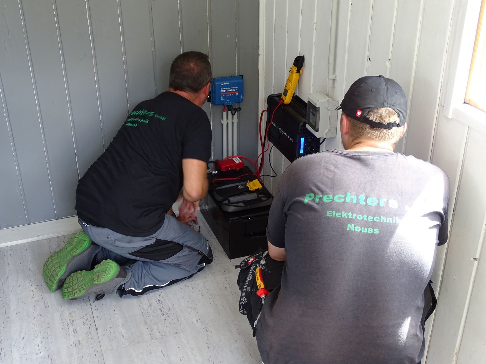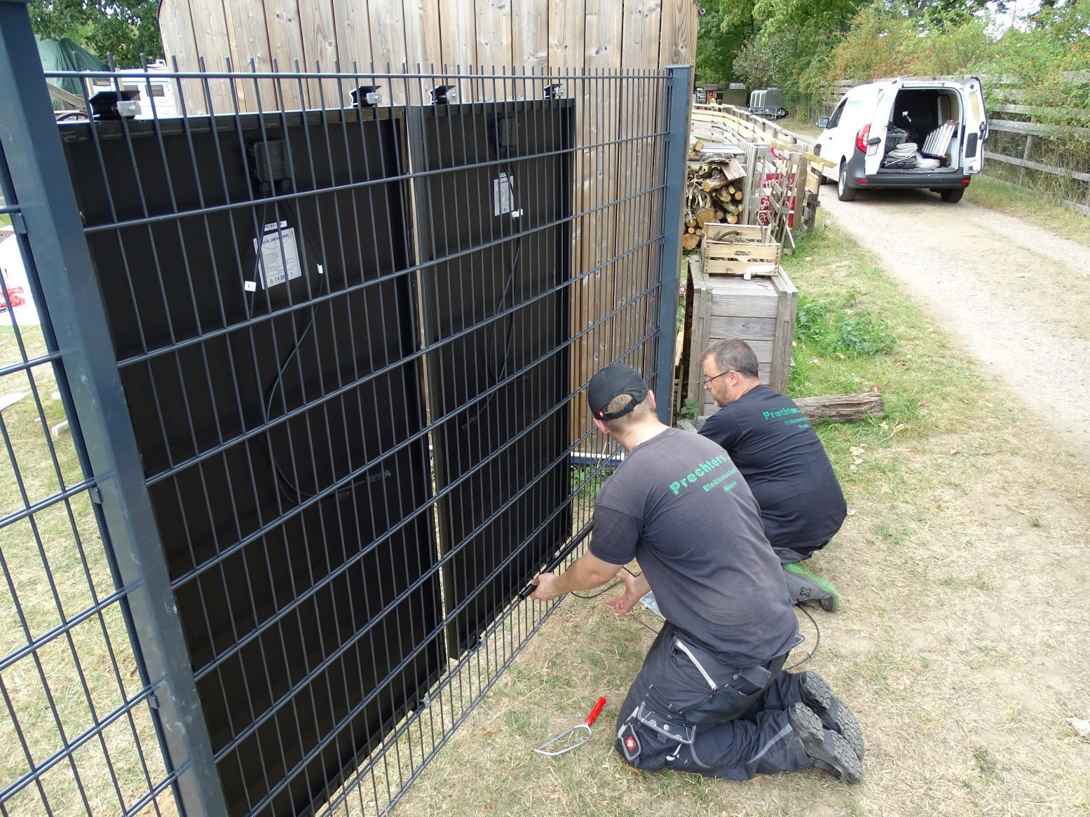 Um für eine bessere Versorgung mit Strom zu sorgen und ihn dorthin zu bringen, wo er benötigt wird, hat der Neusser Handwerk e.V. an der Hütte im Begegnungsgarten ein nachhaltiges Inselkraftwerk mit Solarpanelen installiert, so dass der benötigte Strom vor Ort selbst erzeugt werden kann. Um die später geplante Außenküche und das Kraftwerk etwas zu schützen wurden zudem zwei Gartenzaunelemente verbaut, an denen dann auch die Solarpanele entsprechend montiert und ausgerichtet werden konnten. Außen und in der Hütte wurde auch noch für Beleuchtung und Stromanschlüsse gesorgt, damit dieser Platz auch abends oder insbesondere auch in der dunkleren Jahreszeit genutzt werden kann. Das Inselkraftwerk sowie alle anderen Materialien wurden vom Neusser Handwerk e.V. gespendet und die Arbeiten von den Mitgliedern der Elektro Prechters GmbH (Jochen Prechters und zwei Auszubildende) sowie Michael Heuschen Garten- und Landschaftsbau kostenlos erledigt. Zudem freuen sich die Leiterin der Arche Noah Michaela Danker und Esel Benito über eine Tierpatenschaft, die der Neusser Handwerk e.V. ebenfalls übernommen hat.