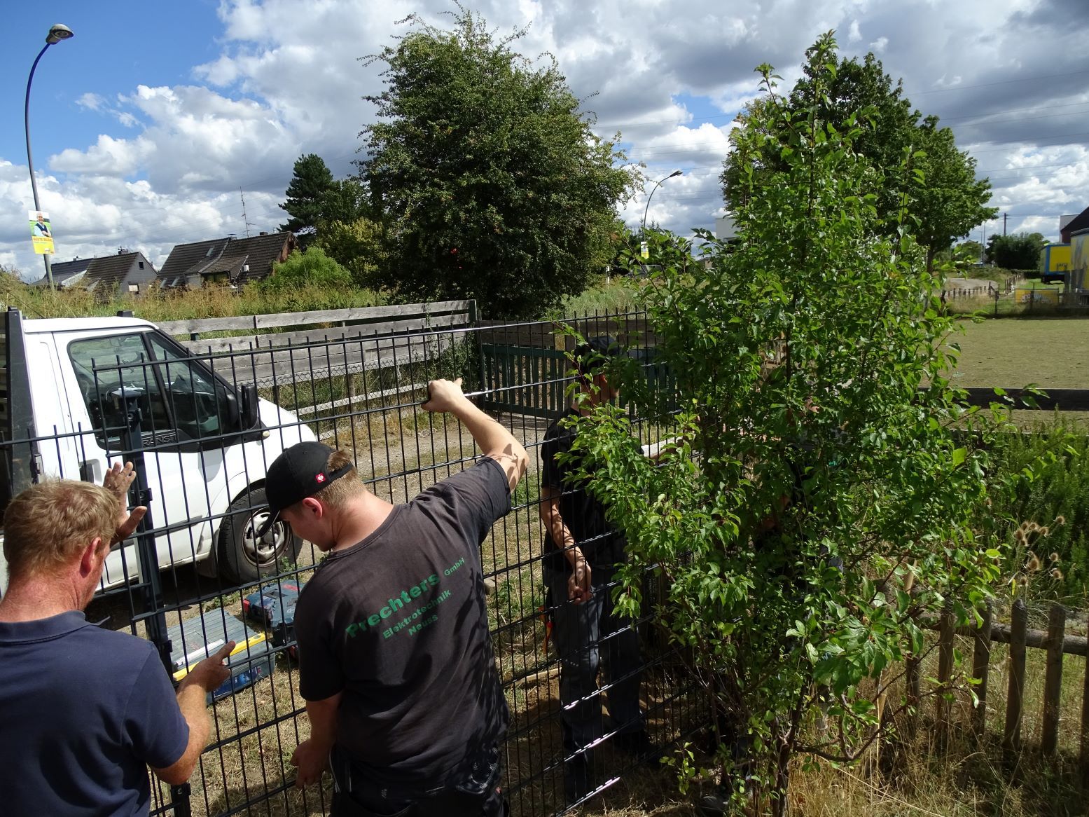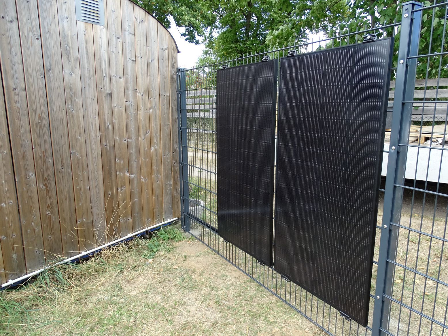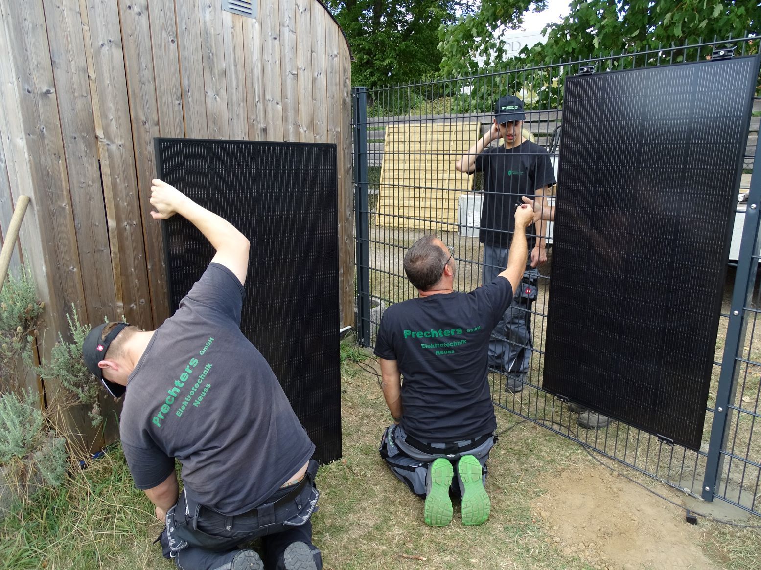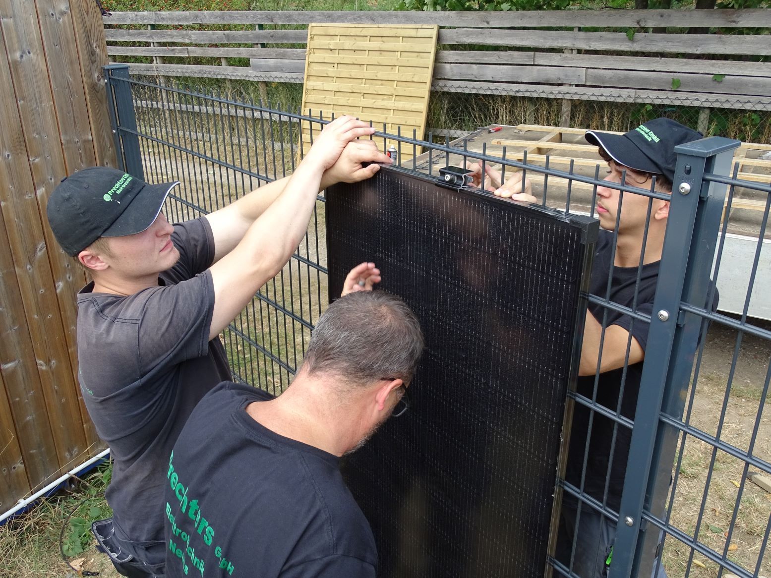 Um für eine bessere Versorgung mit Strom zu sorgen und ihn dorthin zu bringen, wo er benötigt wird, hat der Neusser Handwerk e.V. an der Hütte im Begegnungsgarten ein nachhaltiges Inselkraftwerk mit Solarpanelen installiert, so dass der benötigte Strom vor Ort selbst erzeugt werden kann. Um die später geplante Außenküche und das Kraftwerk etwas zu schützen wurden zudem zwei Gartenzaunelemente verbaut, an denen dann auch die Solarpanele entsprechend montiert und ausgerichtet werden konnten. Außen und in der Hütte wurde auch noch für Beleuchtung und Stromanschlüsse gesorgt, damit dieser Platz auch abends oder insbesondere auch in der dunkleren Jahreszeit genutzt werden kann. Das Inselkraftwerk sowie alle anderen Materialien wurden vom Neusser Handwerk e.V. gespendet und die Arbeiten von den Mitgliedern der Elektro Prechters GmbH (Jochen Prechters und zwei Auszubildende) sowie Michael Heuschen Garten- und Landschaftsbau kostenlos erledigt. Zudem freuen sich die Leiterin der Arche Noah Michaela Danker und Esel Benito über eine Tierpatenschaft, die der Neusser Handwerk e.V. ebenfalls übernommen hat.