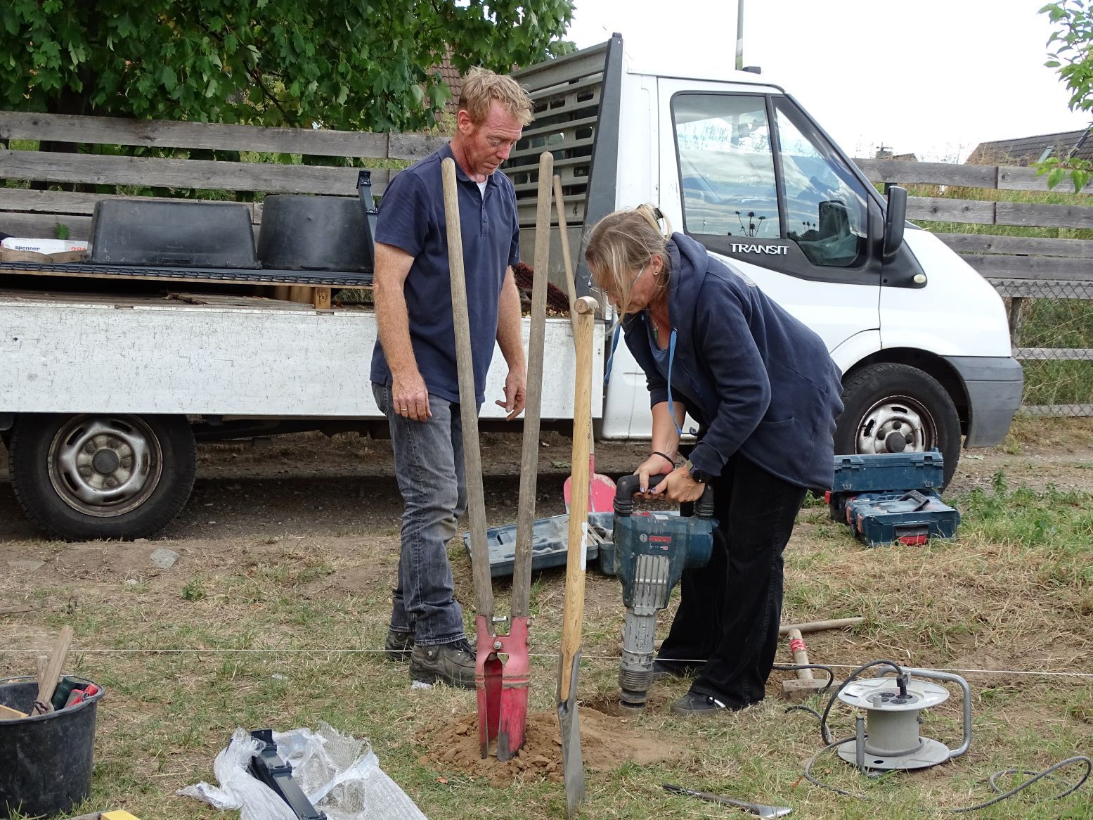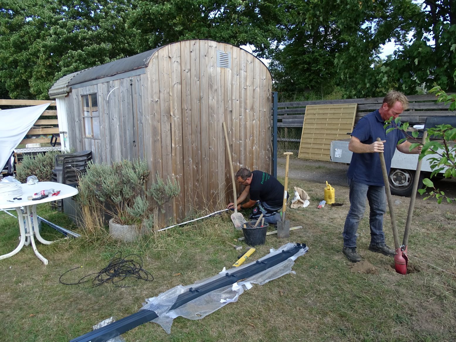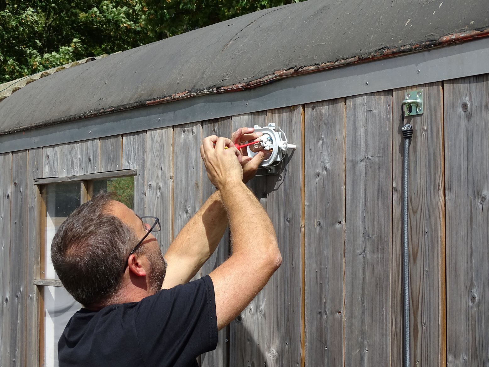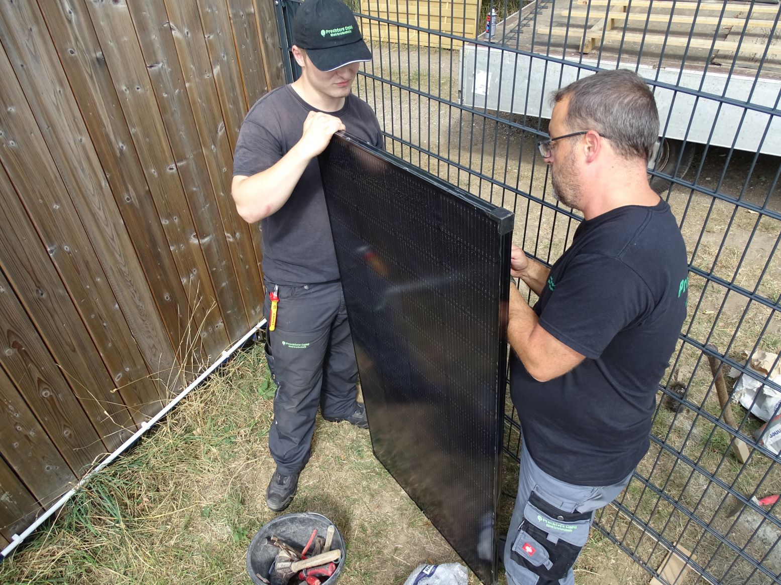 Um für eine bessere Versorgung mit Strom zu sorgen und ihn dorthin zu bringen, wo er benötigt wird, hat der Neusser Handwerk e.V. an der Hütte im Begegnungsgarten ein nachhaltiges Inselkraftwerk mit Solarpanelen installiert, so dass der benötigte Strom vor Ort selbst erzeugt werden kann. Um die später geplante Außenküche und das Kraftwerk etwas zu schützen wurden zudem zwei Gartenzaunelemente verbaut, an denen dann auch die Solarpanele entsprechend montiert und ausgerichtet werden konnten. Außen und in der Hütte wurde auch noch für Beleuchtung und Stromanschlüsse gesorgt, damit dieser Platz auch abends oder insbesondere auch in der dunkleren Jahreszeit genutzt werden kann. Das Inselkraftwerk sowie alle anderen Materialien wurden vom Neusser Handwerk e.V. gespendet und die Arbeiten von den Mitgliedern der Elektro Prechters GmbH (Jochen Prechters und zwei Auszubildende) sowie Michael Heuschen Garten- und Landschaftsbau kostenlos erledigt. Zudem freuen sich die Leiterin der Arche Noah Michaela Danker und Esel Benito über eine Tierpatenschaft, die der Neusser Handwerk e.V. ebenfalls übernommen hat.